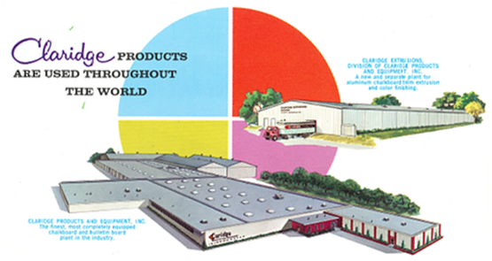 The original Claridge chalkboards were made from slate, but transitioned to Duracite, a chalkboard surface painted an baked into hardboard. In the late 1950s, porcelain enamel steel chalkboards were developed and in 1962, with help from DuPont, Claridge developed a technique called Vitracite, a process that used aluminized steel with a fired-on opaque glassy coating. In 1962, Claridge Extrusion was opened to provide a reliable source of extruded aluminum for trim and other chalkboard elements. Ten years later, the wood shop was created.